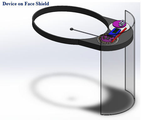 The device needs to be able to fit on the face shield, and the thermistor needs to be able to touch the forehead of the wearer of the face shield. |